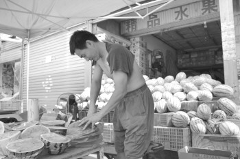 | 水果店老板正在给客户切西瓜。 |