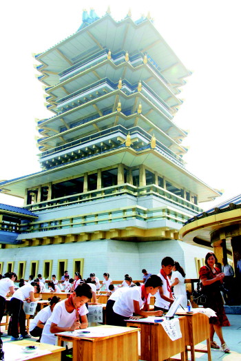 300余名中小学生在书圣阁二楼天台上练习书法。3日上午,第七届中国(临沂)中小学生书法节开幕仪式暨书圣阁启用仪式隆重举行。 本报记者 展萍 廖杰 摄