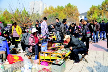 日前,位于华东革命烈士陵园西门附近的花鸟古玩市场,暂时迁至该陵园广场西侧。12日,该市场迎来迁址后的第二个集。图为市民在市场新址选购物品。