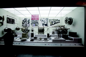 一进入大厅,映入眼帘的是一座沂蒙军民并肩战斗的雕塑,经由两侧浮雕烘托,将沂蒙军民万众一心、同仇敌忾、夺取胜利的场景呈现出来。经扶梯上二楼,走廊两侧是一个个用硅胶还原的革命场景:《大众日报》排版油印车间、妇女“识字班”、山东军区文工团演出、八路军战士刷写抗日标语。握紧的拳头上血管突出,刚毅的脸庞上细纹清晰,参观者仿佛也置身于那个战火硝烟的年代。