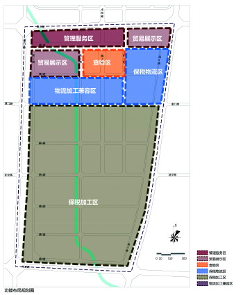 保税物流区主要布置于横2路与横4路之间,重点发展物流增值服务功能,针对附加值高的产品的生产加工、流通加工、产品组装、印刷包装等。