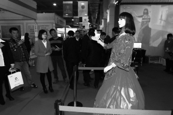 在展示会上,临沂市云计算中心把有语音对话、人机互动的智能仿真机器人搬到现场,让机器人现场宣传。