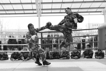 4月21日,在武警临沂支队教导队,武警官兵们正在进行搏击大比武。为了增强武警处突能力,保障临沂社会安全稳定,武警临沂市支队组织特勤分队进行了自由搏击训练、比武。