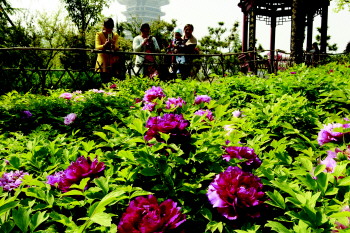 4月22日,临沂市民在园博园菏泽园驻足欣赏国色天香的牡丹。连日来,气温不断攀升,以“国色天香”为主题的菏泽园牡丹盛开。据了解,菏泽园内的牡丹是2012年山东省第四届城市园林绿化博览会建园时引种的,3年来经过园林工人的精心呵护,花儿开得一年比一年鲜艳。 记者 梅鲁生 摄