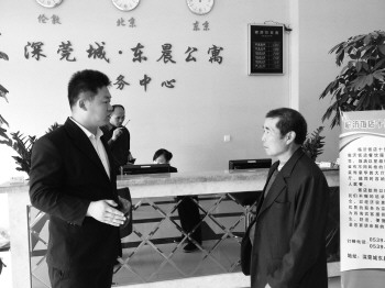 深莞城李经理正在给张守宽(右)介绍新工作情况。 记者 崔洪英 摄