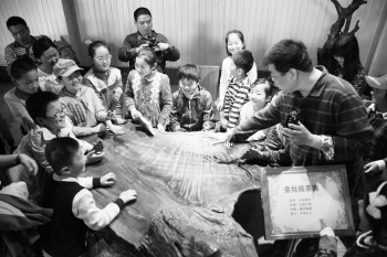 临沂天泽木文化博物馆免费开放,姜开峰为小游客介绍木文化。