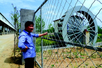 4月27日,记者跟随刘洪听来到河东区汤河闸水利枢纽工程,他的水利发电机的试验机就安装在这里。试验机直径10米,像个小型摩天轮矗立在水渠中。