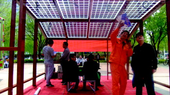 日前,会发电的“玻璃”——光伏面板在临沂人民广场展出,吸引了众多市民围观。据了解,如果一户居民的楼顶花园安装一台玻璃光伏电站,需要安装玻璃光伏面板20平方米,总成本为4.4万元,按临沂正常日照天数计算,自己节省的电费、卖出的余电、加上国家补贴,6年就可以收回成本,还有19年左右可以无成本享受光伏发电的收益。 记者 刘青 摄