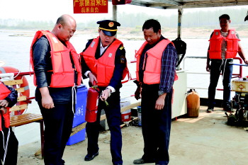 近日,河东海事处工作人员在对禹屋渡口上运输的船只进行安全检查。