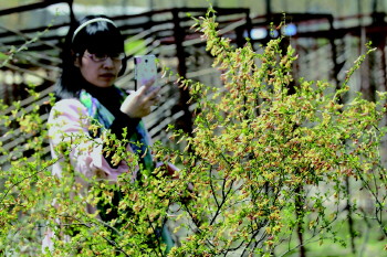 兰山区朱保镇一金雀花苗圃,盛开的红花金雀吸引了人们的目光,纷纷用手机拍照。