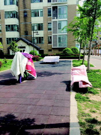 在中丘路的香榭丽都小区,空地上安装了一排健身器材,还有一个乒乓球桌。如今这些地方,甚至连休息椅都让被褥占领。业主杜女士说,平时天气很好的时候,就会下楼逛逛,顺便在健身器材上玩玩,现在小区这样,弄得很不方便。