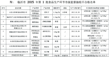 本报5月3日讯 (记者 周广聪)日前,临沂市食品生产环节第1批食品抽检工作顺利完成,市食品药品监督管理局将抽检结果在其网站公布。结果显示,兰山、郯城、兰陵、沂水等县区10家企业生产的10批次食品抽检不合格。
