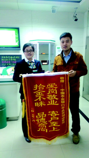 “多亏了农行陈大姐帮我找到钱包,不但挽回了经济损失,五一假期还能顺利出行”。4月25日,南方客户季先生在农行平邑西郊支行激动地说。原来,前几日,柜员陈芳在整理单据时捡到了一个棕色钱包,里面有客户身份证、大宗现金及多张银行卡,随后便及时联系了失主季先生。季先生专程送来锦旗,对农行贴心服务和农行员工高度负责的态度表示感谢。