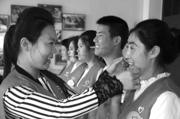 为提高志愿者整体素质,更好地传播文明、服务居民、奉献社会,在5月8日世界微笑日到来之际,柳青街道组织社区志愿者进行了微笑礼仪培训活动。图为5月6日,柳青街道志愿者在社区志愿者活动中心练习“微笑”。 记者 周广聪 通讯员 赵伟 摄