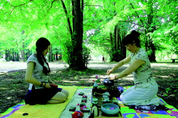 5月13日,茶艺爱好者在临沂生生园里席地而坐,学起茶艺。