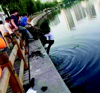 此时,岸边上围观的五六十名市民焦急地等待着落水男孩被救上来。待落水男孩被杜加利和崔连选拖到岸边,几名市民一起将他拉上来,赶紧让他跪在地上,给他控水。他们俩也被好心的市民拿着绳子拽上了岸。