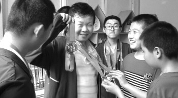 19日,运动员王甲宝和同学们一起分享获奖的喜悦。5月11日,第六届特奥会在四川开幕。临沂天使国际特教学校派出8名运动员、3名教练员代表山东省参加了乒乓球和滚球项目的比赛。经过8天的激烈角逐,19日,运动员载誉而归,荣获1金4银12铜的好成绩。 记者 罗志强 摄