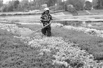 5月20日,滨河景区小埠东橡胶坝管理所工作人员对苗木上的“白色网具” 进行清理。