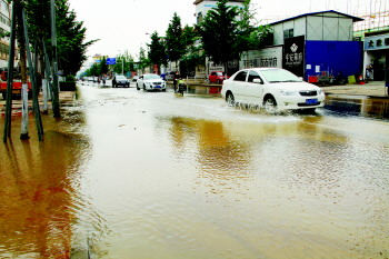 27日中午,市区平安路与通达路交会处东的塑料厂家属院门前,自来水管道老化爆裂,清水上涌冲坏人行道。实康水务对该区域进行停水抢修,300余户居民家中暂时停水。经过5个多小时的抢修,晚上7点自来水管修复完毕并恢复供水。 本报记者 徐升 摄