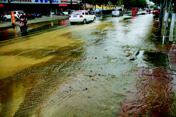 27日13时许,在市区平安路与通达路交会处东100米处,在马路北侧的人行道上,夹杂着泥土的自来水不断涌出,流淌到马路上,车辆驶过溅起高高的水花。