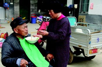 吴景勤照顾公公吃饭。