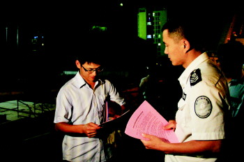 执法人员对工地夜间施工进行规范。 记者 徐升 摄