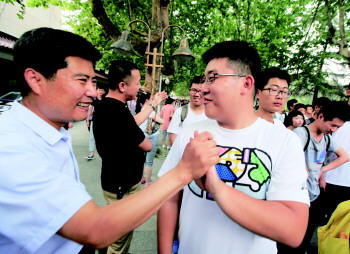 考试结束后,考生与老师击掌庆贺。 记者 廖杰 摄