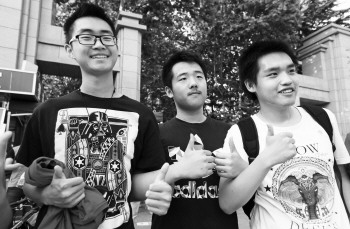 8日,高考结束,三位走出考场的考生对着镜头竖起了大拇指。 记者 廖杰 摄