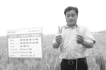 近日,我市小麦迎来丰收季节,临沂商城植保行业进入旺季。在郯城县苗山镇丰和农场试验田,临沂海丰植保有限公司工作人员展示通过新技术种植的高产小麦。据了解,通过该新型拌种肥种植的小麦可增产25%。