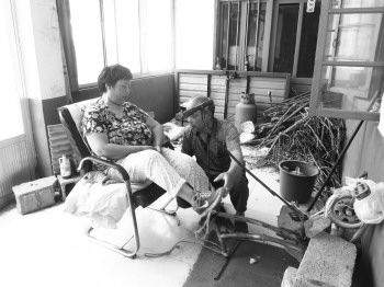 王有论正在帮助曹克菊用自己制作的康复器材做康复训练,“这个是我用旧三轮车改装的,是仿照医院的康复器材做的。”王有论说,医院的康复器材实在太贵,家里根本买不起。
