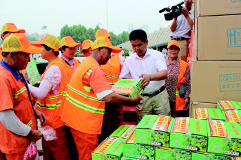 6月23日,由临沂市慈善总会、市文化中心管理办公室、市公共关系协会联合山东宏星食品有限公司,山东六普实业股份有限公司、山东兰陵清华泉商贸有限公司共同主办的“城市美丽、感恩有你”向环卫工人奉献爱心大型公益活动启动仪式在临沂市文化中心举行,临沂市爱心企业向环卫工人捐赠了水杯、遮阳帽和银杏酱等价值8.8万元的物品。 记者 徐升 通讯员 王文昌 摄