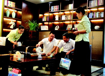 客户在财富中心品茶聊天。
