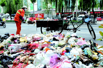 21日清晨5点半左右,临沂环卫集团三分公司项目经理朱艳平在进行早班巡查时,发现市区通达路和北园路交会处的北园春天(也叫泰兴花园)小区门口路面上堆满了垃圾,占到了整个路面的四分之三。