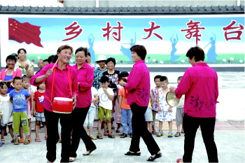 7月28日,蒙阴县联城镇城子社区文化广场上,来自四个村庄的女支书在表演自己编排的节目《拥军情》。她们通过群众喜闻乐见的表演形式,义务为社区群众演出,迎接八一建军节的到来。