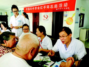 义诊现场,市人民医院专家王自然(右一)向居民讲解预防心脑血管疾病知识。 本报记者 周广聪 摄