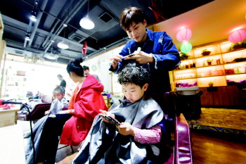 ◥在市区一家理发店内,理发师正在为小朋友做发型。