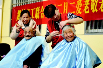 郯城县义工联合会义工来到马头镇敬老院,为行动不便的老人免费理发。