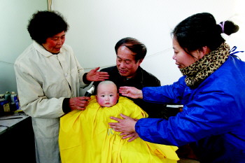 兰山区银雀山街道后岗头村一理发店内,一位村民抱着孙子“剃龙头”。