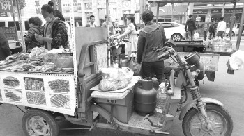 市区一处商场旁,流动的餐车上几乎都有一个液化气罐。