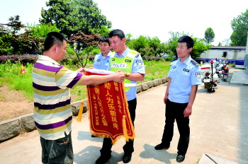 本报6月4日热线消息(记者 李墨 通讯员 陆永文 姚聪聪)6月1日,河东区九曲街道办事处褚庄社区的村民刘先生将一面写有“助人为乐新风尚,感谢人民好交警”的锦旗送到了河东交警大队特勤中队辅警沈兰升、张俊忠、朱发军手中,以表达对他们危急时刻伸手相助的感激之情。